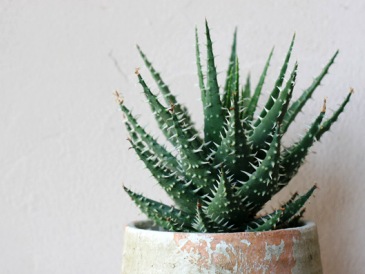 アロエ・ベラは幹が立ち上がらず、葉がロゼット状につく種類で、 大株にすると存在感のあるインテリアプランツとなりますが、 葉模様に特徴のあるものはミニ観葉にして、他の多肉植物などと 混植するのも人気があります。